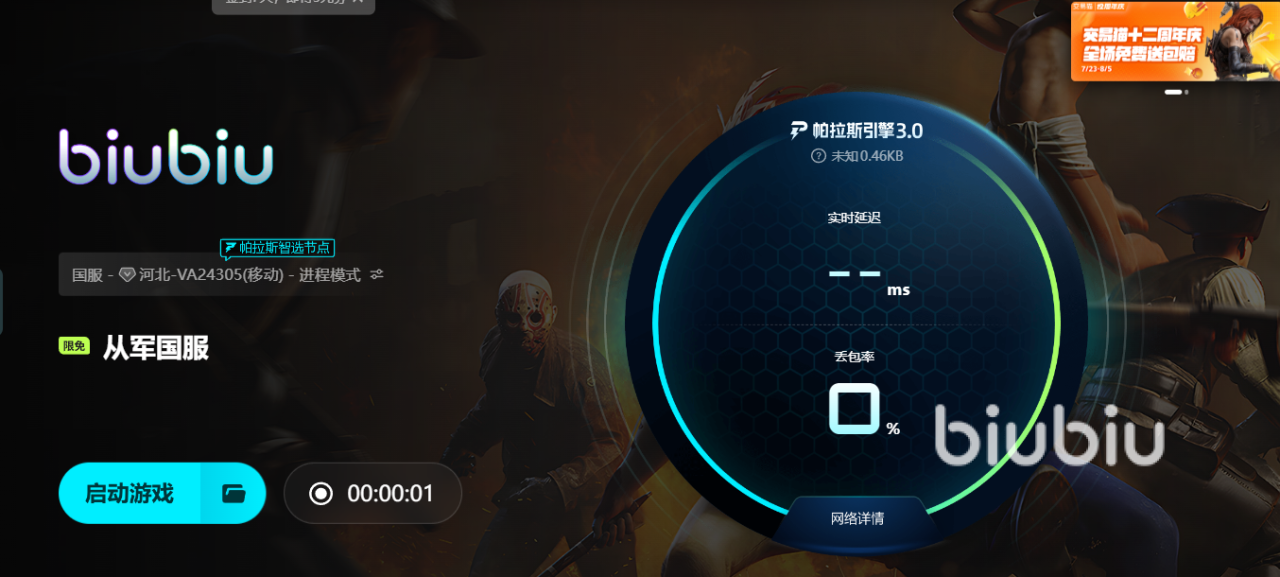 此外,biubiu加速器的另一大优势在于它的强大引擎支持。biubiu与冠军选手Aixlefth合作,并引入了帕拉斯引擎3.0,这一加速引擎能够实现更高效的网络优化,尤其是在游戏数据传输、延迟管理、节点调度等方面,表现尤为突出。通过帕拉斯引擎3.0,biubiu可以有效降低玩家在复杂网络环境下的掉帧、延迟、卡顿等问题,保障每场游戏都能流畅进行。对于《从军》这种需要高精准度反应的战略射击游戏来说,biubiu加速器无疑是提升游戏体验的重要工具。