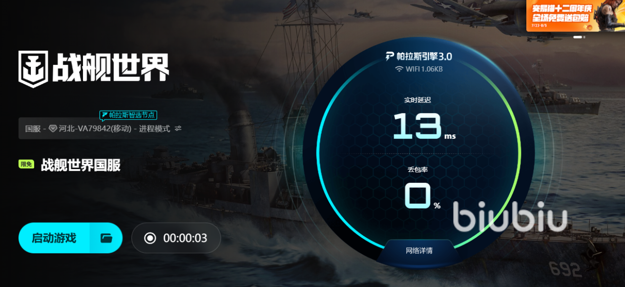 biubiu加速器不仅注重加速效果,还与众多电竞冠军选手进行合作,进一步优化了加速技术。例如,biubiu与Aixleft合作,引入了帕拉斯引擎3.0技术,这一创新引擎使得加速效果更加稳定,能应对更复杂的网络环境,保证即使在高峰时段,玩家也能享受到流畅的游戏体验。帕拉斯引擎3.0技术的加入,使得biubiu加速器在优化游戏性能时更加高效,能够解决包括掉帧、延迟、卡顿等各种常见的游戏问题。无论玩家是在激烈的战斗中,还是在进行战舰的操作时,都能享受到无缝的连接和流畅的操作感受。