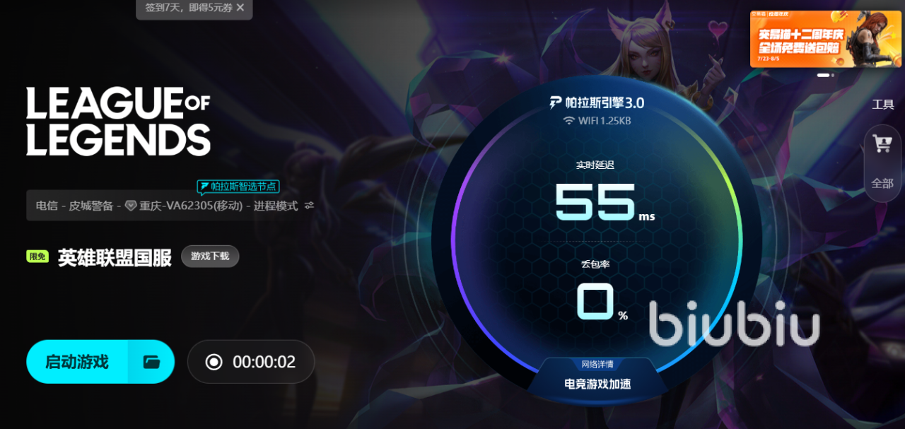 在众多加速工具中,biubiu加速器无疑是目前玩家群体中极具口碑的一款。其引入了全新的帕拉斯引擎3.0,不仅在基础加速技术上进行了深度升级,还与职业冠军选手 Aixleft 联手进行实战优化,对包括《英雄联盟》在内的多款热门电竞游戏提供了专属加速策略。通过智能路径调度与节点切换,biubiu可以实时监控玩家所连接的服务器状态,并自动匹配最优传输线路,有效降低延迟、稳定数据传输、减少丢包现象。无论你是在打排位、玩云顶,还是与朋友组队娱乐,都能享受到更加流畅无阻的游戏环境。