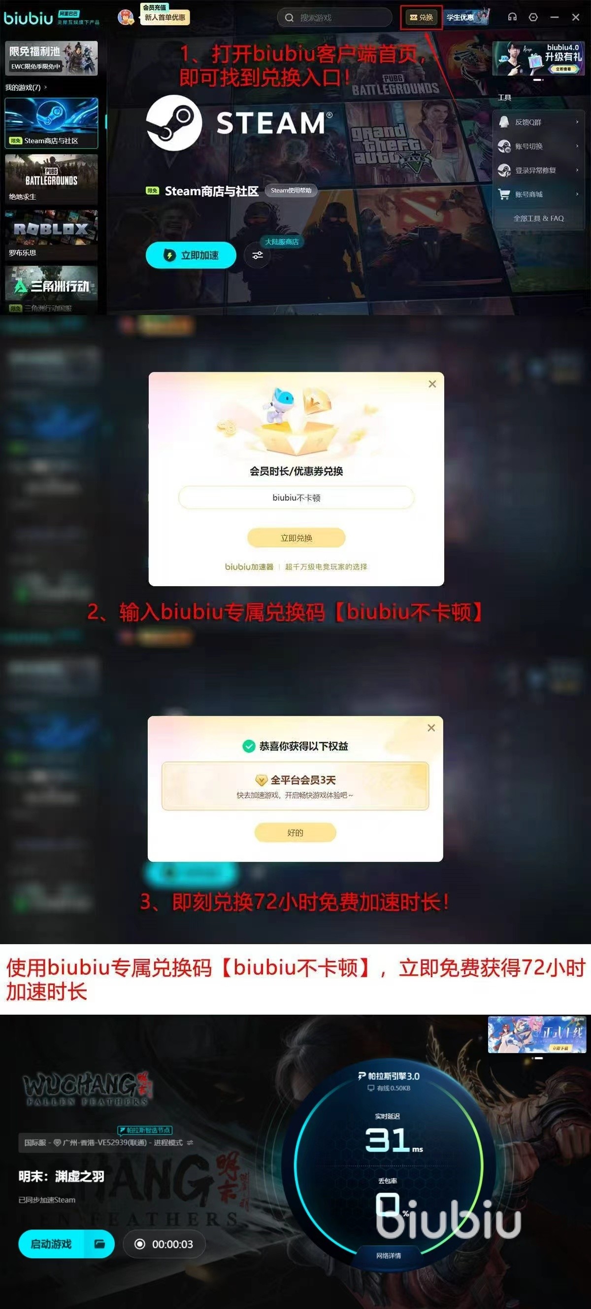 biubiu加速器诚意满满,专为玩家量身打造了“先享后买”的贴心福利。新用户注册登录后,即可立即享受24小时免费加速时长,让你在没有任何压力的情况下,轻松感受游戏体验的提升。而更加惊喜的是,无论新老用户,大家都可以参与首页的兑换活动,输入福利码【biubiu不卡顿】,再获得72小时免费加速时间!。biubiu加速器通过强大的优化技术,助你突破网络瓶颈,随时随地都能享受极速无缝的游戏体验,让你在每一场对决中都能够轻松应对,打破所有障碍,做最强的游戏王者!