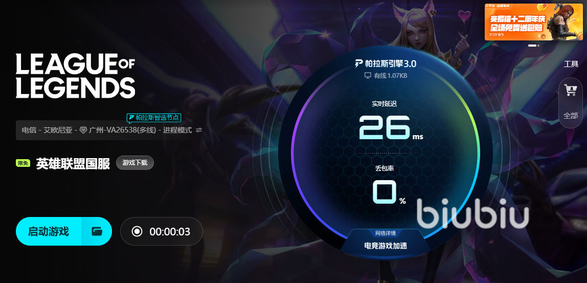 biubiu加速器的核心在于其对网络传输链路方面的深度优化,这一次更是带来了重磅升级,与冠军选手Aixleft合力打造,通过帕拉斯引擎3.0技术,让玩家能把游戏数据分散至不同通道传输,有效规避单一路径的拥堵,确保到时的长时间游戏情况下,数据能足够的稳定。