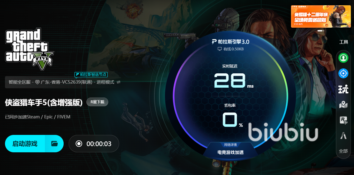 要知道,这一次biubiu加速器可是迎来了重磅升级!此次升级亮点颇多,比如针对gta5带来的单人战局、外置准星等都是其中之一,不仅与冠军选手Aixleft强强联手、合力打造,更是引入了先进的帕拉斯引擎3.0,让玩家能感受到软件带来的专业效果,其中的R星平台修复更是能让玩家确保游戏顺利兼容,不用在担心闪退等问题的出现,为玩家带来前所未有的极致加速体验。