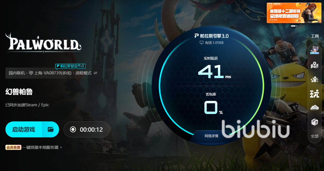 以上便是幻兽帕鲁闪退的全部内容了,玩家在游戏的运行期间,如果发现经常出现掉帧、延迟高等方面的问题可就很难受了,而biubiu的使用就能很好地为大家去解决这些方面的问题,确保游戏在传输过程中的稳定性,各位近期要是有打算就抓紧去点击上文链接来安装吧。