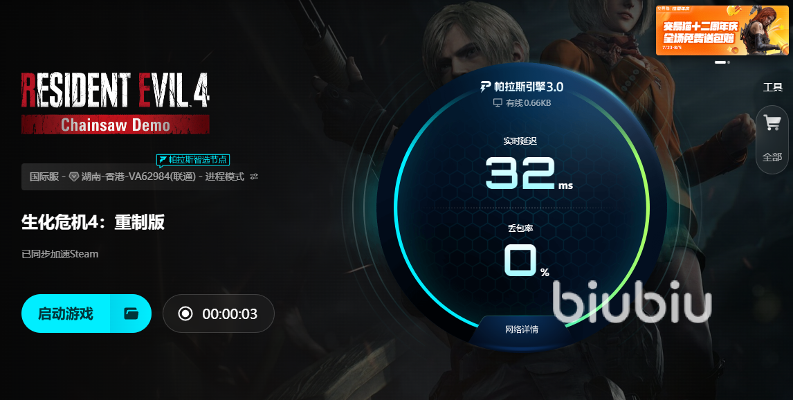 最后,需要注意的是,除了网络问题,显卡能力不足,硬盘空间不足以及游戏文件不完整等问题也是发生闪退的原因之一,这些大家都需要多加注意,不过这些问题发生一般都会有错误弹窗提示大家。以上就是小编分享的“生化危机4闪退解决办法”内容,最后提醒各位生化4游戏的玩家,加速器最佳效果体验,必须率先将biubiu启动游戏才可以。