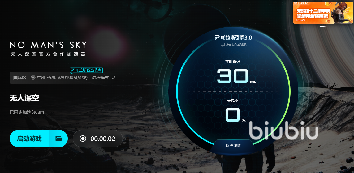 由于无人深空服务器的特性,所以解决服务器问题和本地网络问题,要更为重要,这里推荐近期刚刚对功能做重大升级的biubiu加速器,biubiu充分利用其一线云服务器大厂优势资源,为玩家搭建了许多分布全球的游戏专用通道,玩家游戏速度通过这些通道可以更快更稳定的传送到服务器,加快登录和游戏速度,在服务器异常时,还会启用增加数据发包通道,确保数据完整及时的传递到服务器,避免发生严重掉帧问题。