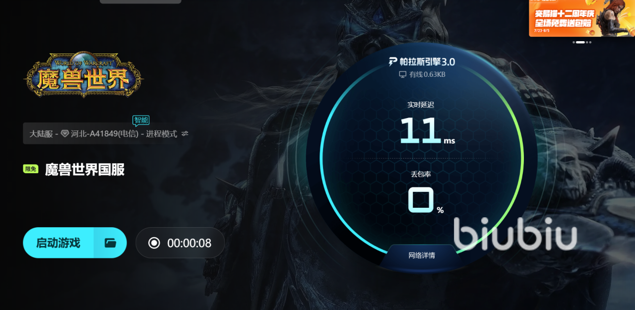 在解决魔兽世界网络延迟问题上,biubiu加速器的出色能力在众多加速器中脱颖而出,它能让大家在游戏世界中避免网络问题的困扰,新用户注册即可获得24小时免费时长,输入【biubiu不卡顿】还能额外兑换72小时免费时长,biubiu加速器有了帕拉斯引擎3.0的帮助,同时与冠军选手Aixleft共同合作迎来了重磅升级,能够非常有效的稳定网络连接,同时可以有效解决并避免卡顿掉线等网络问题的出现,不论是在团队副本中配合输出,还是在战场中冲锋陷阵,都能让小伙伴们拥有流畅的网络体验。