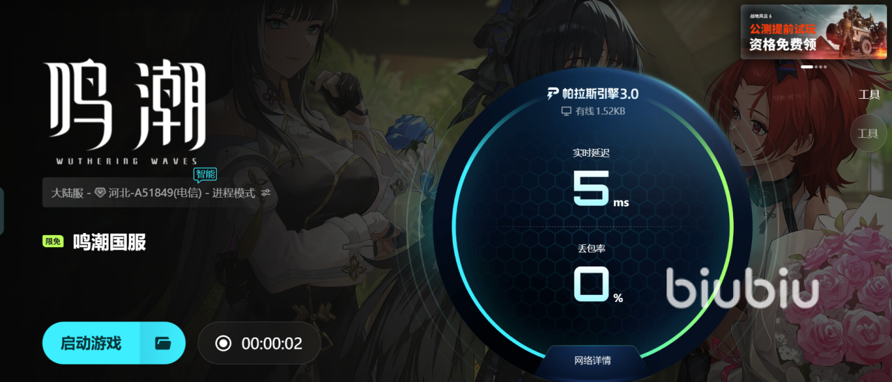 在解决鸣潮闪退问题的同时,想要让游戏网络更稳定,biubiu加速器一定会是一个不错的选择,新用户注册后可获得24小时免费时长,输入【biubiu不卡顿】还能额外兑换72小时免费时长,biubiu加速器与冠军选手Aixleft合力打造后,加入了帕拉斯引擎3.0,能够有效确保在多人联机或资源加载时数据传输顺畅,让小伙伴们专注于连招操作和剧情探索,尽情享受异能冒险的乐趣。