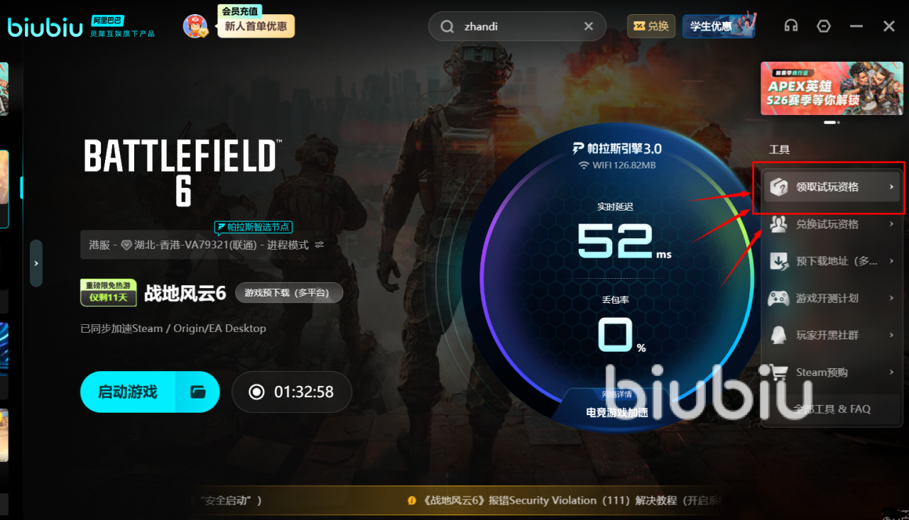 总之,战地风云6B测资格领取方法教程就为大家介绍完了,目前Biubiu的任务抽取终极测试免资格通道,仍为玩家提供多重机会。而且在实战中,网络优化直接决定体验成败。长期而言,EA或通过“战地实验室”持续发放资格,建议玩家提前注册并完善问卷偏好,为后续测试铺路。最终,高效利用现有渠道,结合硬件与网络预调,方能在跨平台战场上抢占先机。