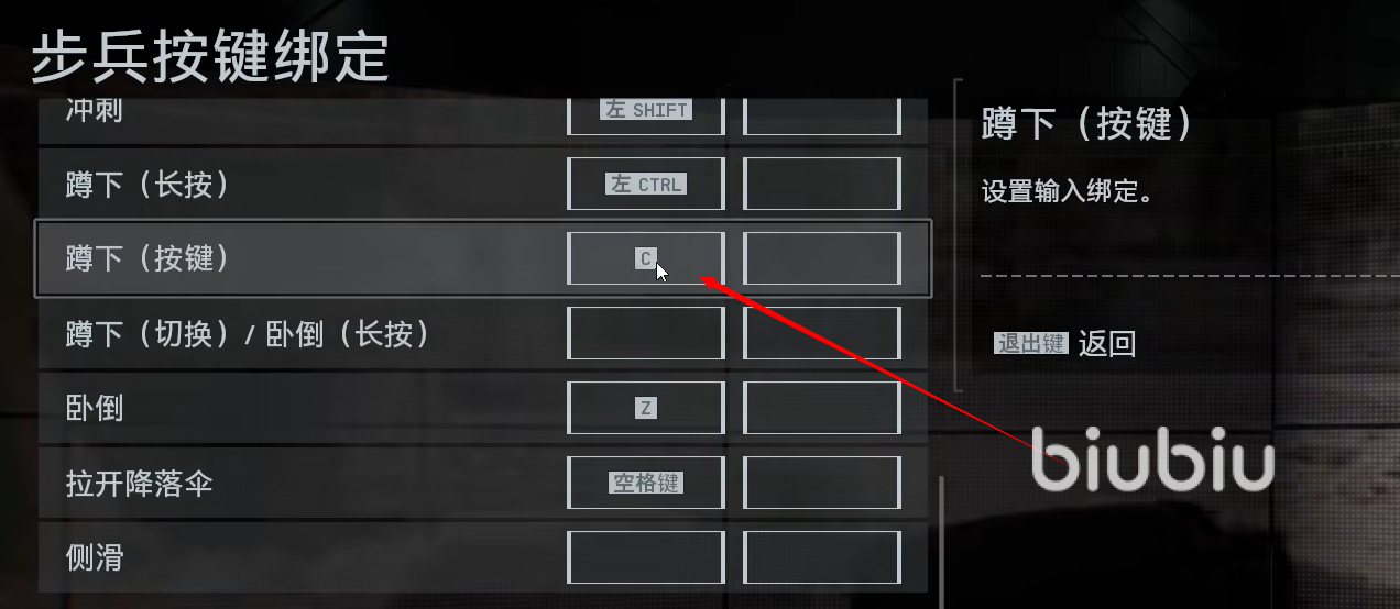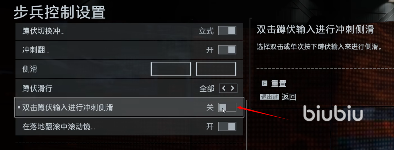 滑铲优化:将“冲刺侧滑”设为关闭,注意要看一下按键绑定里的设置,蹲下实现单次按压(默认C键)直接触发滑铲,提升机动性。