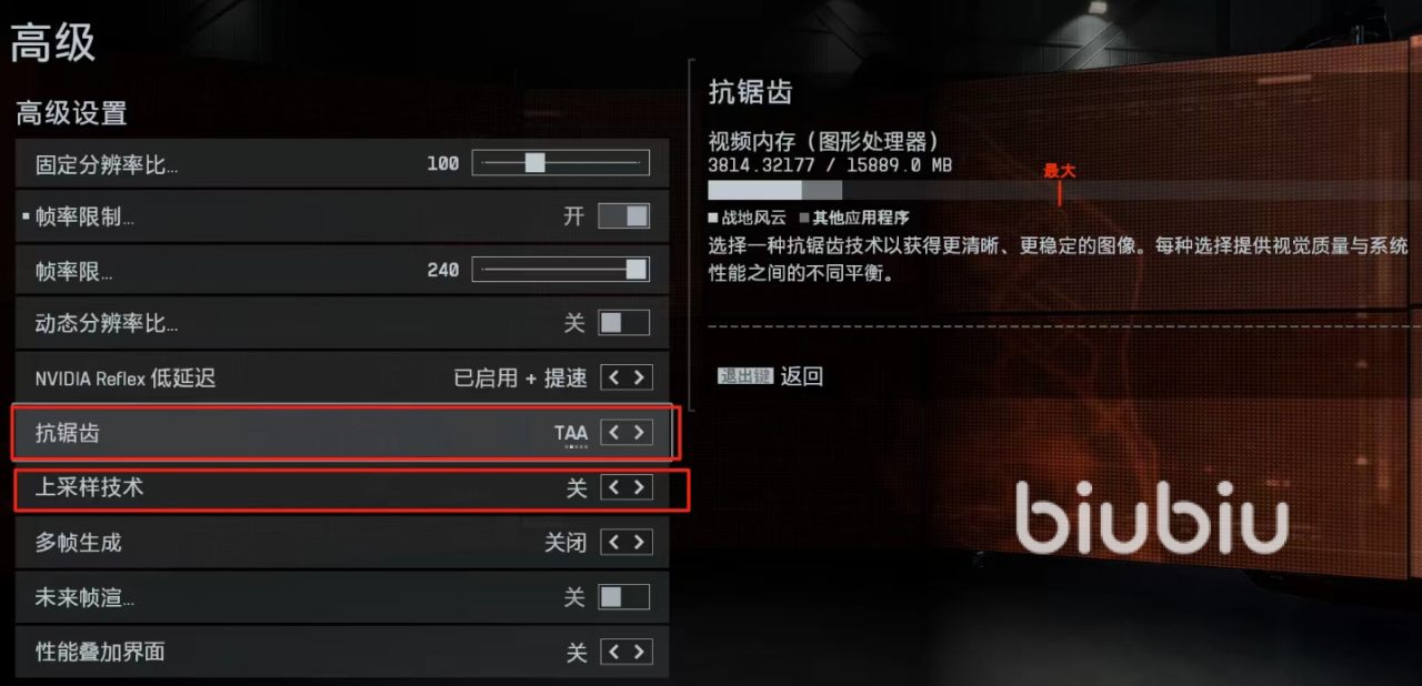 DLSS/FSR选择:开启DLSS(质量模式)或FSR 4,帧数可提升40%且无明显输入延迟;若遇内存溢出(如无限占用),改用TAA抗锯齿。