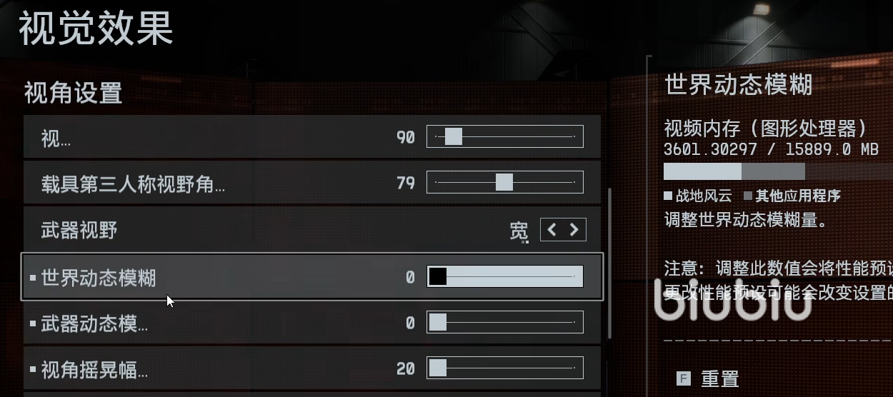 将“世界/武器动态模糊”“视角晃动”拉至0,关闭“色差/暗角/胶片颗粒”,减少视觉干扰与眩晕感。