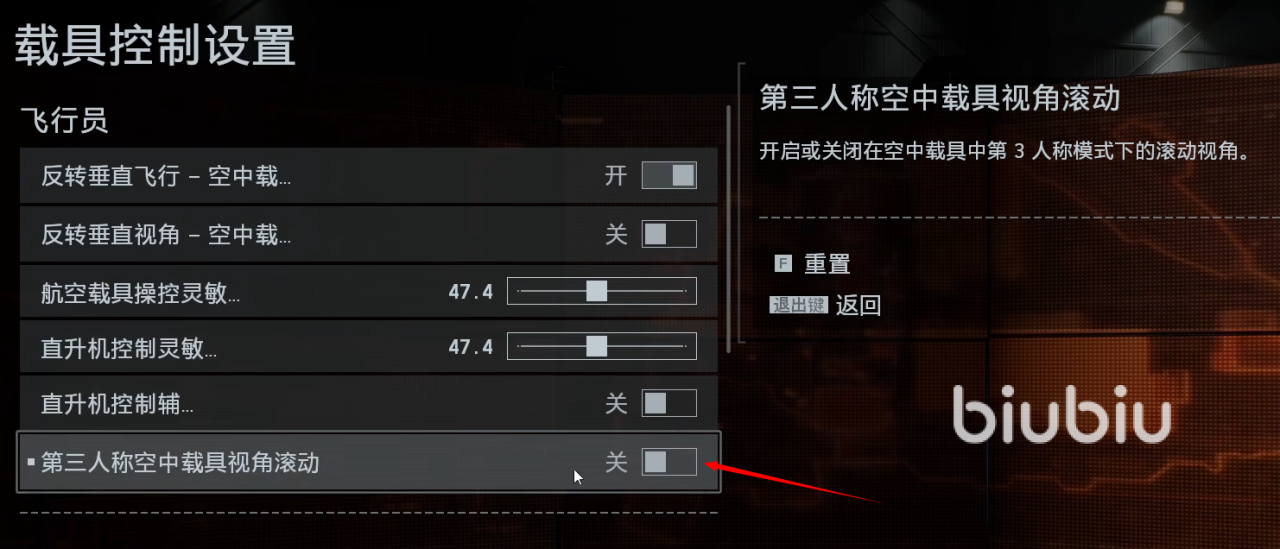 飞机防眩晕:关闭“空中滚动视角”,防止机身翻滚时地面参照物旋转导致的眩晕。