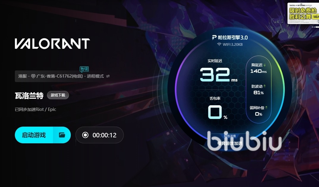 biubiu的强大加速性能,还得到冠军选手Aixleft支持,在其多次配合检测下,最终完成此次升级,升级后的biubiu能给大家更稳定,更持久和高效的加速环境,现在,新注册的玩家注册后将有24小时免费体验福利,另外新老玩家还能使用【biubiu不卡顿】口令,再在客户端兑换到3天免费体验时间,新玩家通过这两个活动所获得时间可叠加到96小时。