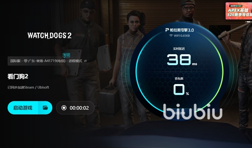 以上就是“看门狗2一进去就闪退回桌面解决办法”的所有内容,从统计数据来看,解决网络问题是解决游戏问题最重要途经,因为超过70%的游戏问题都是网络环境不好造成的,因此玩游戏前提前安装并启动biubiu加速器是不错的选择。另外提醒大家,想要看门狗2获得加速效果,需要在启动biubiu加速器后再打开游戏。