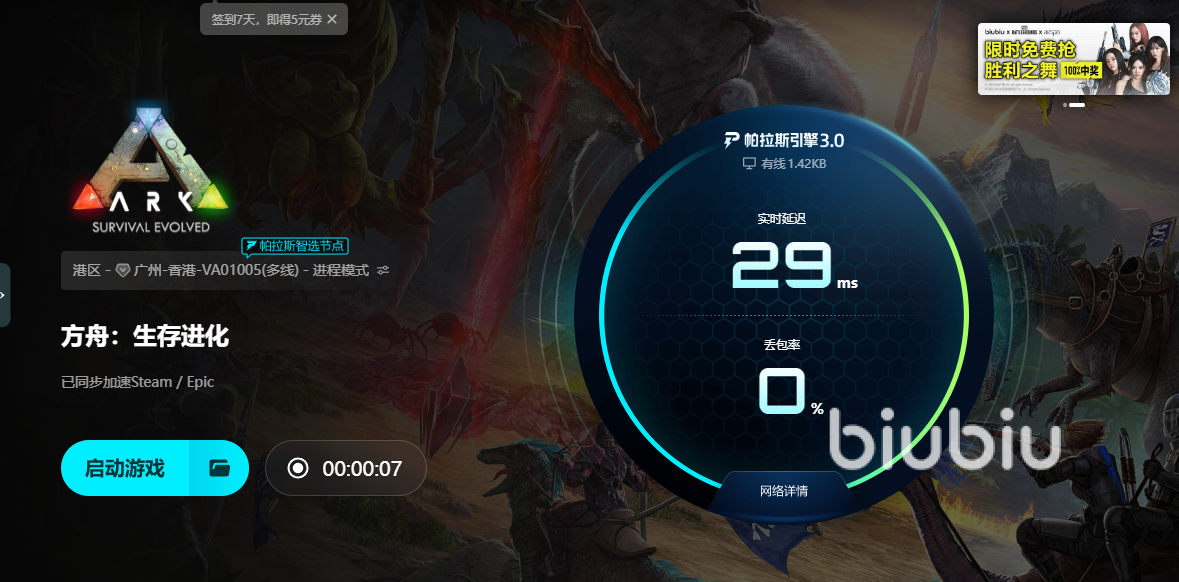 总之,无论发生方舟进化生存进不去游戏怎么办,大家首要选择就是使用该程序将本地的网络进行梳理加速,然后体验游戏时就会得到实质性的速度与稳定的验证,有证据表明,解决了游戏的网络问题,基本上可以解决打游戏过程中产生的70%左右的问题。最后提醒大家,想要方舟能得到biubiu加速效果,必须先启动biubiu,在启动加速后再打开游戏才可以获得。