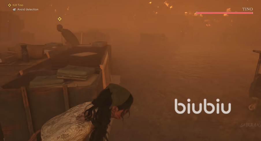 沿灌木丛潜行至马车侧翼,当蒂诺背对时触发“暗杀提示”(按E键)。
