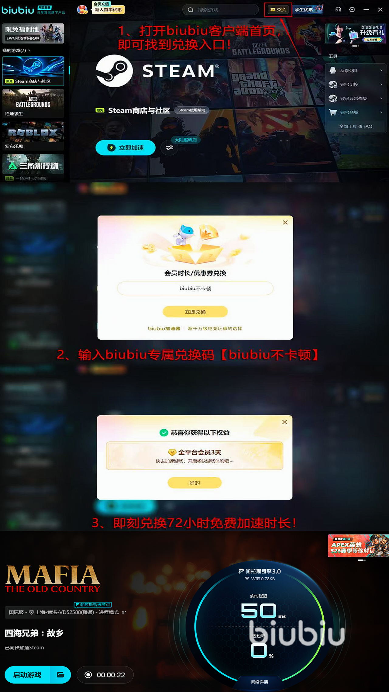 一部分玩家会选择联机游玩共同完成任务,但多人联机时容易出现网络卡顿问题,那么针对这类问题还是很推荐使用 biubiu 加速器的,并且新人在注册后便能获得 24 小时免费加速时长,以及新老用户使用兑换码【biubiu 不卡顿】可额外领取 3 天免费的使用权哦!