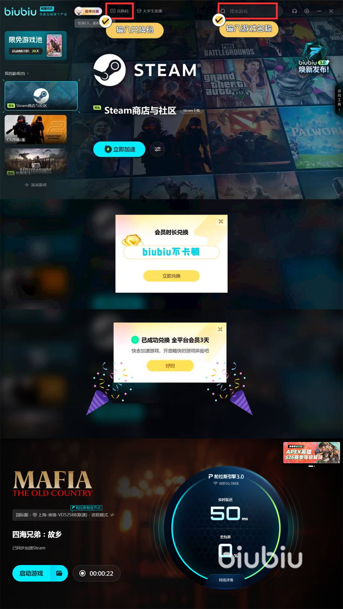 很多玩家反映在玩这款游戏的时候经常遇到延迟高、闪退这样的情况,甚至直接无法连接服务器,其实只需要biubiu就能轻松搞定。相比于之前,biubiu现在进行了重磅更新,自身的加速引擎以及升级到了帕拉斯3.0,还专门邀请了冠军选手Aixleft配合一起进行性能改进,达到了电竞级的效果。新用户注册新账号,继续享受24小时会员时间的赠送福利,另外每个biubiu账号还有一次使用兑换码【biubiu不卡顿】的机会,直接得到三天会员时间,所以免费试用的时间是非常充裕的。
