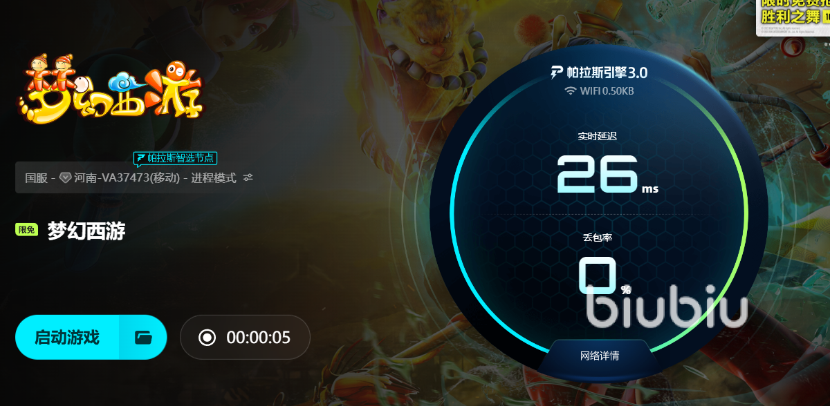 这时候biubiu加速器的作用就凸显出来了。它搭载的帕拉斯引擎3.0能实时扫描梦幻各大区的网络节点,像给数据开了条 “专用道”。比如跨区打副本时,传统路径可能要经过5个拥堵节点,引擎会自动切换到仅需2个节点的直连通道,把延迟压到40ms以内,丢包率降到0.3%以下。与冠军选手Aixleft的合作,让加速策略更贴合梦幻的玩法——在帮派战、比武大会等多人场景中,引擎会优先传输角色移动、技能释放的指令。