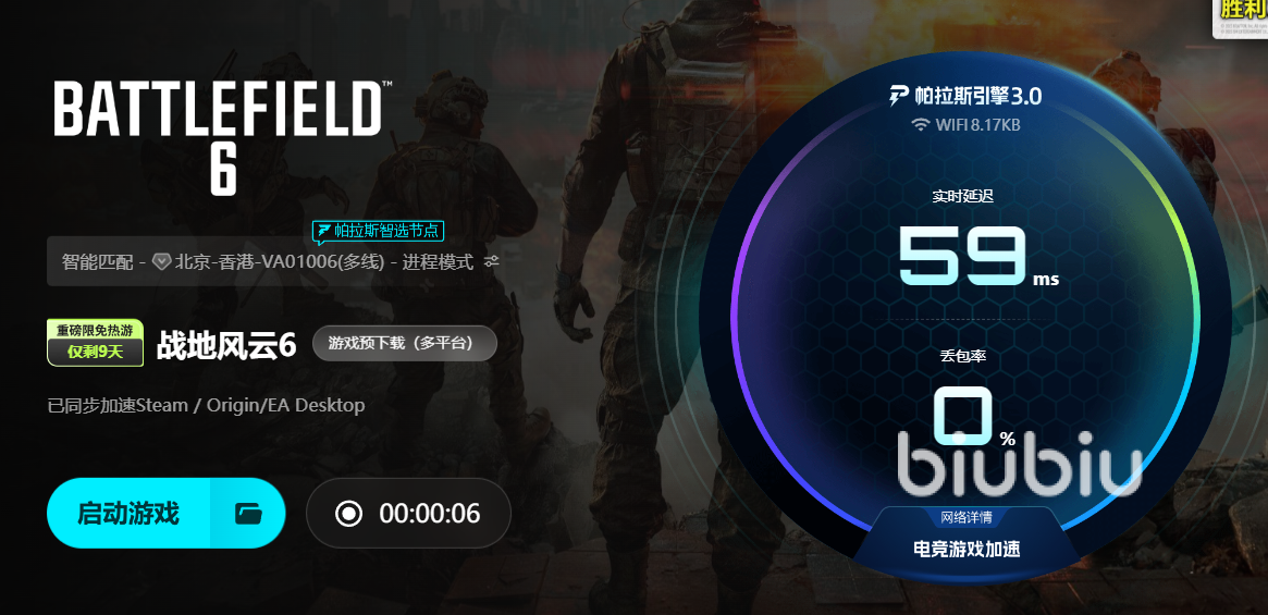 对玩家来说,验证效果的门槛极低。新用户注册biubiu即可获得24小时免费加速,足够测试从服务器列表加载到战局进入的全流程;输入口令【biubiu不卡顿】还能额外兑换72小时,合计96小时的免费体验,覆盖早中晚三个高峰时段。操作也极为简便,下载后搜索 “战地” 选择对应版本,点击 “开始加速”,系统会自动匹配当前网络下最优的服务器节点,哪怕是初次使用加速器的新手,也能在30秒内完成设置。许多玩家反馈,使用后不仅加载失败的情况消失,连之前频繁出现的 “战局内突然踢出” 问题也大幅减少,终于能完整体验128人战场的震撼。