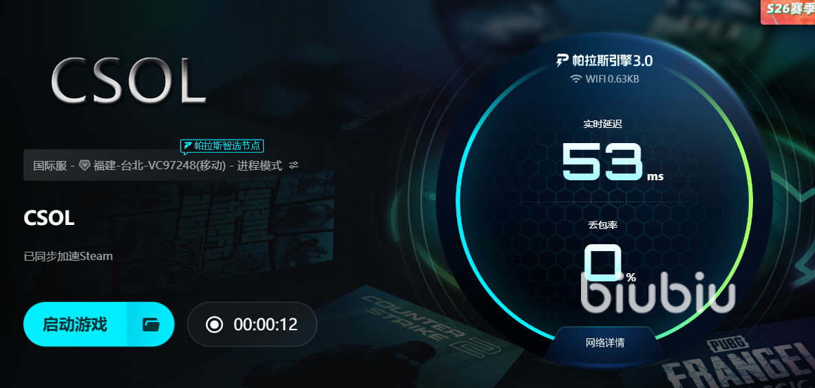 面对本地问题,手动调整设置能解决大半,但网络引发的加载卡顿,就得靠专业工具疏通传输通道。biubiu加速器针对CSOL的网络验证流程做了专项优化,恰好能补上这块短板。其搭载的帕拉斯引擎3.0,会直接匹配专线通道,将验证请求的响应时间从200ms压缩到100ms以内,确保在服务器超时前完成全部校验。