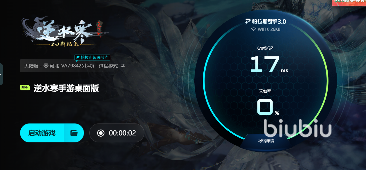 网络链路的拥堵或验证超时则是更隐蔽的阻碍。尽管是国产游戏,桌面版仍需与服务器进行加密验证,高峰时段(晚7点至10点)单服同时在线人数突破十万,验证服务器压力陡增,普通网络容易出现 “握手失败”。跨区玩家的问题更突出,比如海外用户连接国内服务器时,数据需经过多个国际节点中转,某个节点的突发故障会让验证请求超时,表现为 “登录失败,请重试”。这类问题无法通过修复文件解决,因为数据从设备到服务器的传输是否通畅,才是能否进入游戏的核心。biubiu其搭载的帕拉斯引擎3.0在检测到数据包丢失时,会立即启动冗余数据补传,确保位置、技能等关键信息不中断。与冠军选手Aixleft合作,哪怕网络波动,也能保证指令在80ms内完成同步,避免因延迟导致的闪退。