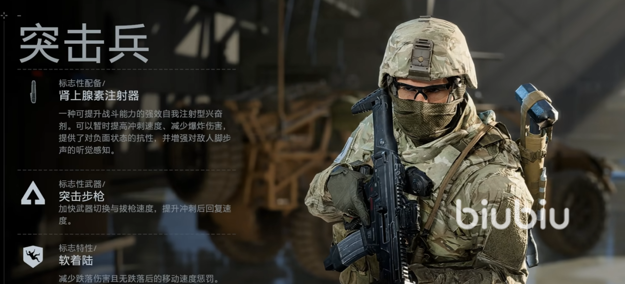 工程师 | 反载具/建筑破坏 | 双筒携带(RPG+毒刺,总备弹5发) | 载具维修效率提升,火箭弹对步兵溅射伤害增加 |