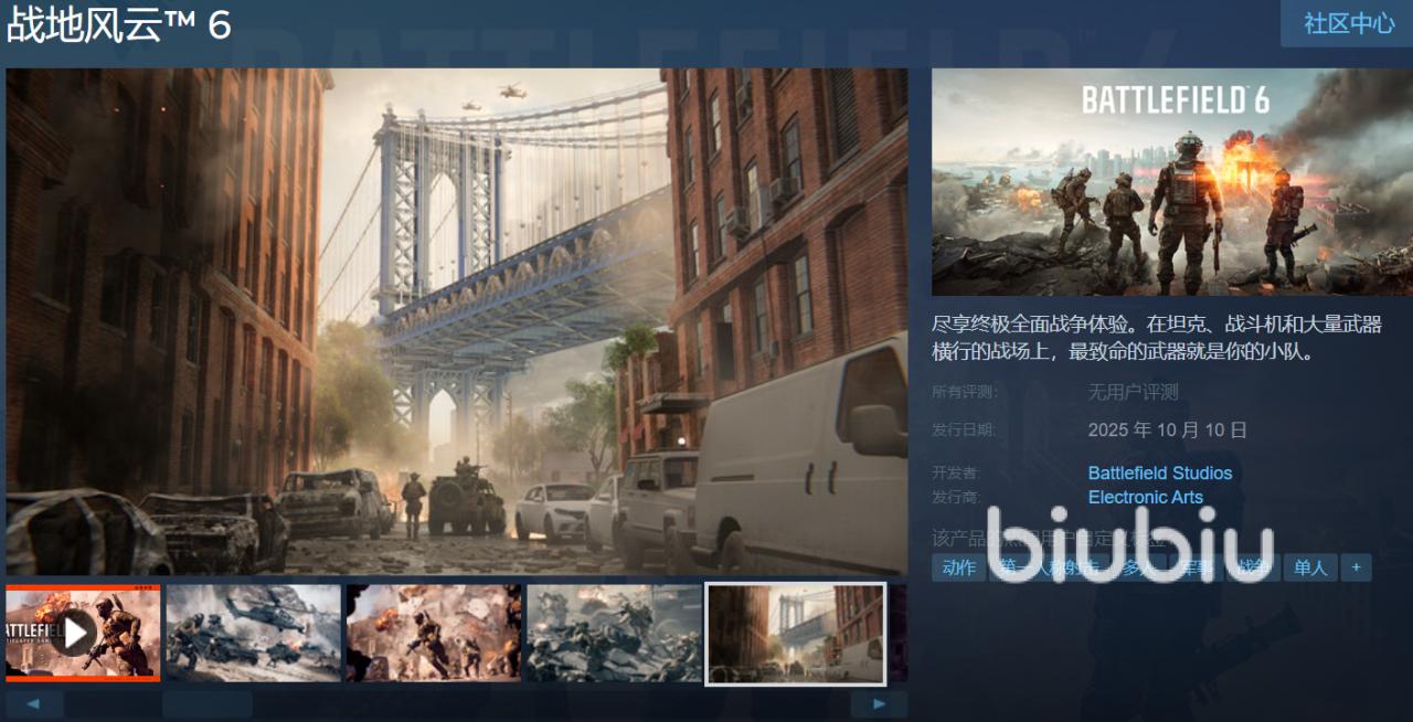 战地6在steam上的正式名称为战地风云6,英文名字是Battlefield 6,玩家可以直接搜索中文名称战地风云6来找到这款游戏。由EA发行,支持中文配音,预计2025年10月10日正式发售。无论你是系列的老玩家,还是新入坑的玩家,都可以通过Steam平台轻松找到并下载这款游戏。