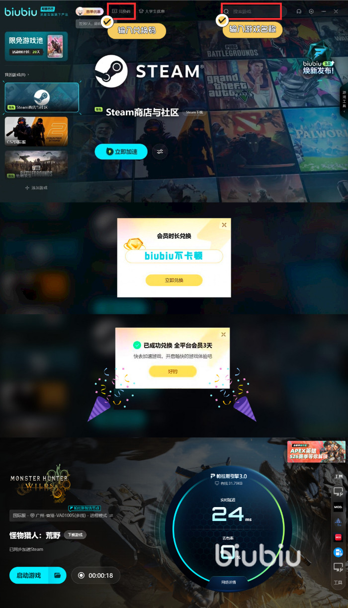 在寻找足迹蜥蜴的过程中,网络状况至关重要。若游戏频繁卡顿,很可能导致玩家错失发现足迹蜥蜴的良机。这里给大家推荐biubiu加速器,首次使用的新用户有24H时长免费使用,【biubiu不卡顿】输入到指定兑换框能再领72H。与知名冠军选手Aixleft展开合作,并且引入了先进的帕拉斯引擎3.0,能够有效降低游戏延迟。