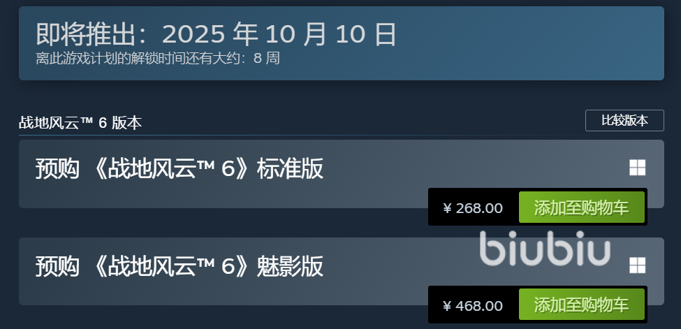 战地6将于2025年10月10日登陆Steam平台、PlayStation平台和Xbox平台,但不包含Xbox One/PS4等上一代主机。预购时间从2025年7月31日已经开启,公测时间8月9日-10日、8月14日-17日,预购版本标准版268元、幻影版468元。