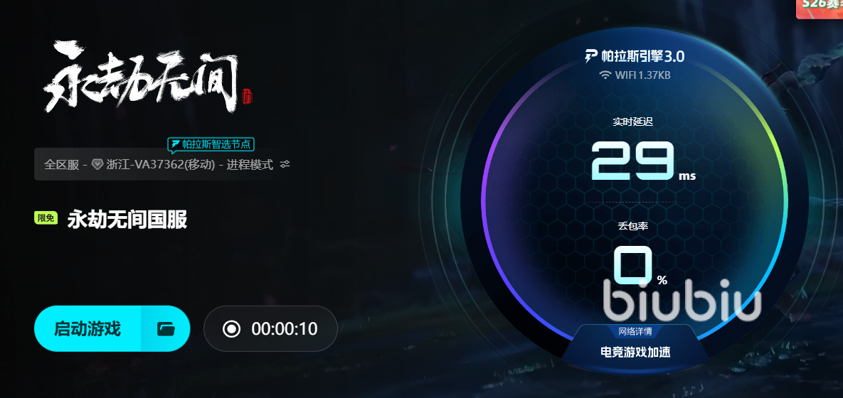 对玩家来说,尝试成本几乎为零。新用户注册即可获得24小时免费加速;【biubiu不卡顿】还能兑换72小时,覆盖周末高峰、跨服匹配等场景。操作也足够简单,下载后搜索 “永劫无间”,点击 “开始加速” 就能自动匹配最优节点,无需手动选择服务器,哪怕是新手也能一键搞定。不少玩家反馈,使用后在 “天人城” 百人混战中再没出现过闪退,连之前频繁崩溃的 “暗域蔓延” 阶段,也能稳定跑完整个缩圈过程。