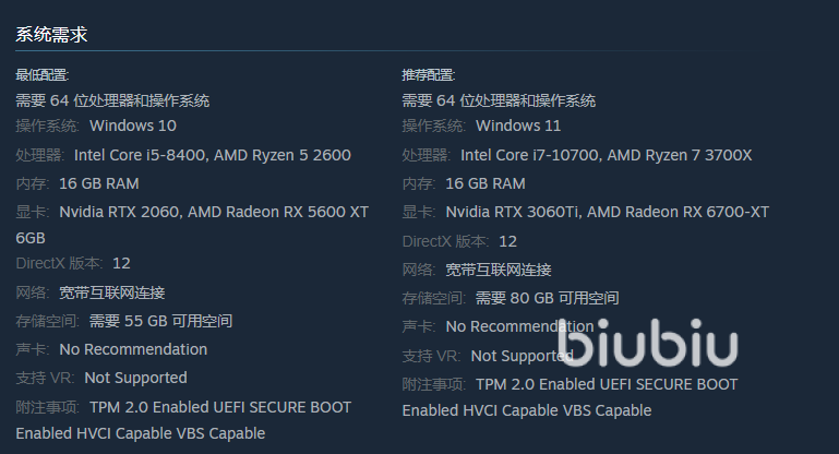 官方在合作的平台上已经公布了相关的配置需求,当玩家达到最低配置时,只能运行最低的画面特效,要满足Core i5-8400的处理器,Nvidia RTX 2060的显卡,然后需要提供16GB的运行内容以及55GB的存储内容。