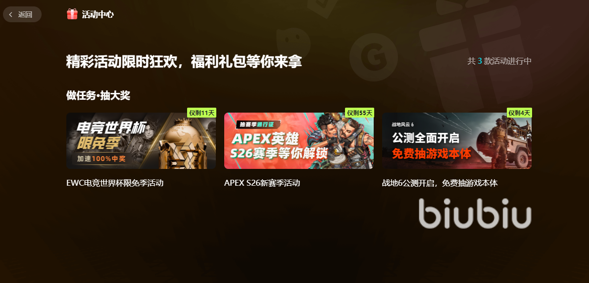 达成这些配置需求之后,各位能准备好参与游戏。如果有使用加速器的需求,可以来试试biubiu,在测试期间它是对战地6进行免费加速的,还有抽奖活动开放,参加就能得到biubiu时长卡或者游戏资格码。