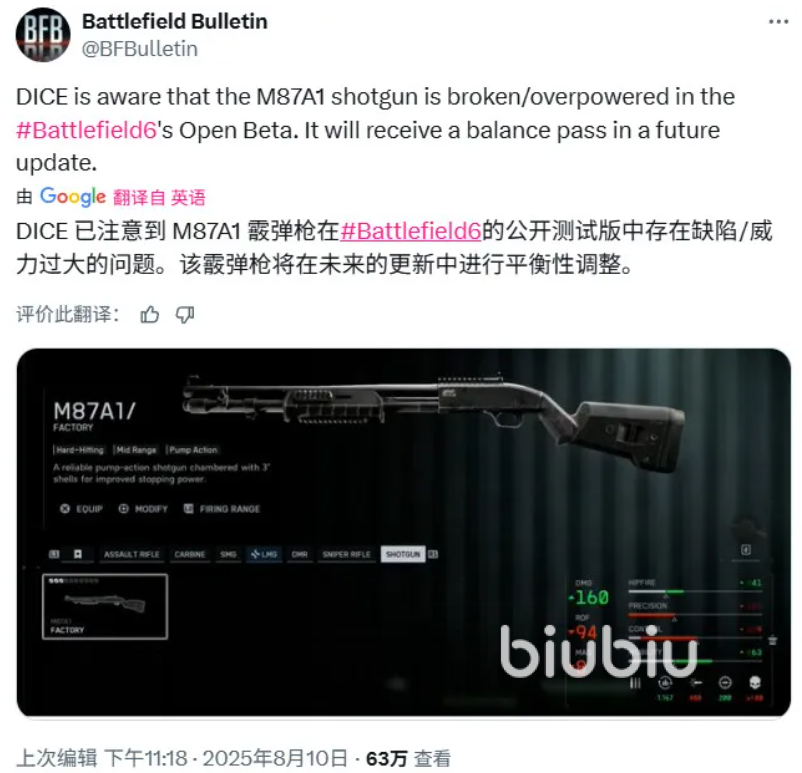 霰弹枪削弱:M87A1因近距离秒杀过强被标记,正式版或将调整伤害衰减或射速。