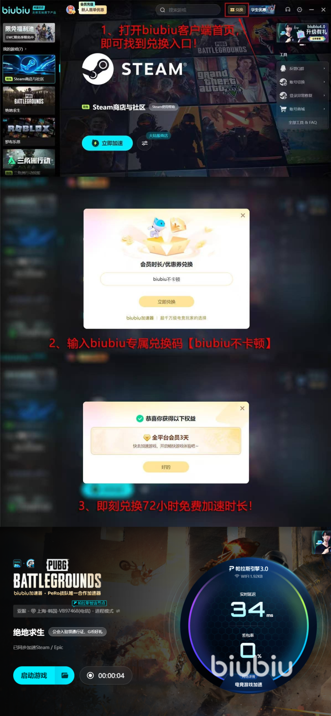 值得一提的是最近该加速应用还进行了全新的升级,带给小伙伴们更流畅的体验,引入了帕拉斯引擎3.0系列,还是经过了超人气冠军选手Aixleft认可所共同推出的,如果大家也想体验一番职业级的流畅环境,现在就可以体验新用户还可享受超多福利,比如登录即可拥有24小时免费提速服务,此外,平台还给每个用户额外提供三天试验时长,需要大家自己手动输入【biubiu不卡顿】进行领取才行。