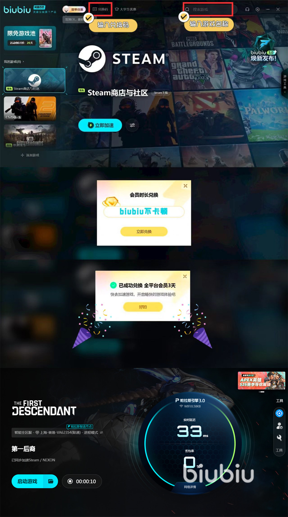 第一后裔这款游戏的第三赛季已经于2025年8月7日正式发布,新赛季包含诸多内容,主要包括全新游戏故事、联动内容、全新战场、全新终极武器、全新载具以及全新玩法等。为了帮助大家在新赛季能够获得更爽的游戏体验,小编推荐biubiu这款工具给诸位玩家。现在biubiu进行了重磅升级,在优化的时候,特别邀请了冠军选手Aixleft,一起合力打造,提升性能改进问题,还引入了帕拉斯引擎3.0,目的就是为了给用户呈现电竞级别的加速效果。而且现在新注册的账号,立即就能直接得24小时加速时间,新用户可放心注册加入进来。每个biubiu号都可以使用一次兑换码【biubiu不卡顿】,得到三天加速时间。通过biubiu运行游戏之后,就可以克服很多网络方面的问题,做到轻松流畅运行。