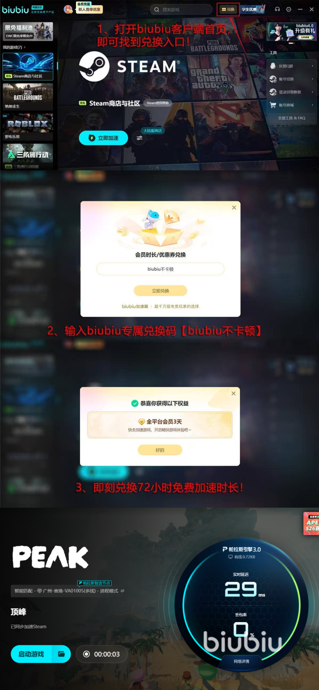 上方给大家提供的提速应用简单好用,而且还有很多福利,比如新用户注册即可享受长达24小时的免费提速服务时间,这是系统自动发放的,无需大家手动领取。此外平台还给每个小伙伴都额外提供了其他福利,比如三天的体验时长,这个需要大家自己在专属区域输入【biubiu不卡顿】才可以。