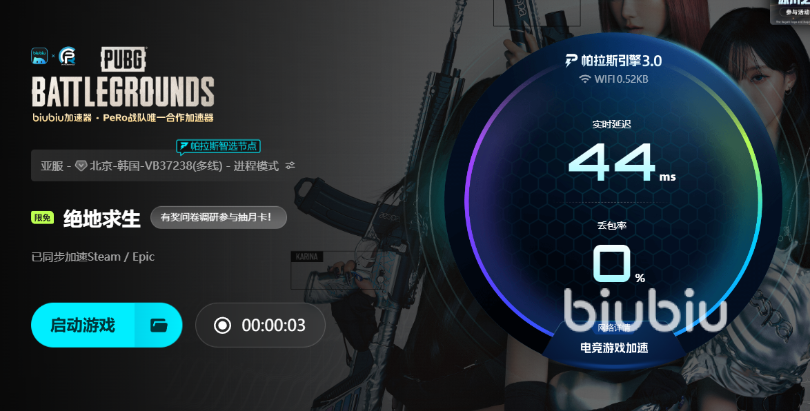 在解决PUBG闪退问题的过程中,很多玩家会忽略一个关键点——网络优化的持续性。即使一次加速能够缓解问题,但在长时间游戏、跨天游玩或进行多场比赛时,如果网络延迟忽高忽低,闪退风险依旧存在。biubiu加速器在这一点上有着长期稳定的表现,其与冠军选手Aixleft的合作不仅验证了其在高强度电竞环境下的稳定性,还凭借引入的帕拉斯引擎3.0实现了更高效的数据传输路径优化。该引擎在减少网络抖动、稳定延迟方面的效果尤为明显,使得玩家即使在网络高峰期也能保持游戏的稳定体验,这对于避免突发闪退有着重要意义。