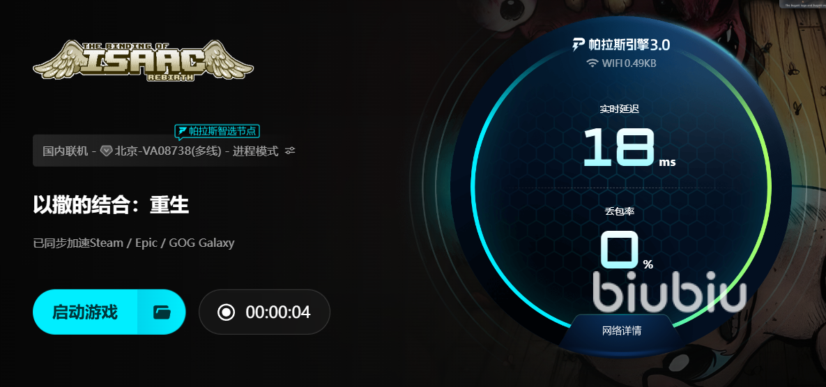 对付这些问题,选对工具很重要,biubiu加速器就是个靠谱的选择。它专门针对《以撒的结合》做了优化,背后可是有“大神”加持——和冠军选手Aixleft深度合作,把他在竞技游戏里对“稳定”的极致追求,融入到了对这款地牢游戏的加速方案里。更关键的是它搭载的帕拉斯引擎3.0,这东西就像给数据装了“导航系统”,能智能避开网络拥堵的“岔路”,直接找到最快的传输路径。玩《以撒的结合》时,不管是加载新楼层的地图,还是同步你的“伊甸之苹果”收集进度,数据都能跑得又快又稳,减少因为传输中断导致的闪退。