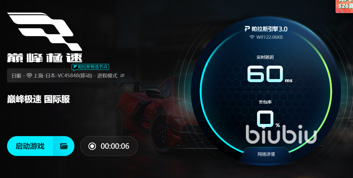 面对这类网络问题,biubiu加速器的优化方案很有针对性。它搭载的帕拉斯引擎3.0,能自动避开网络拥堵路段,为游戏数据开辟专属通道。和冠军选手Aixleft的合作更是锦上添花,这位对操作精度要求极高的选手,参与调校了竞速场景的加速参数,让车辆加速、刹车等关键指令的传输延迟大幅降低。实测中,使用biubiu后,多人竞速时的数据包同步效率提升明显,因网络问题导致的闪退概率下降不少。