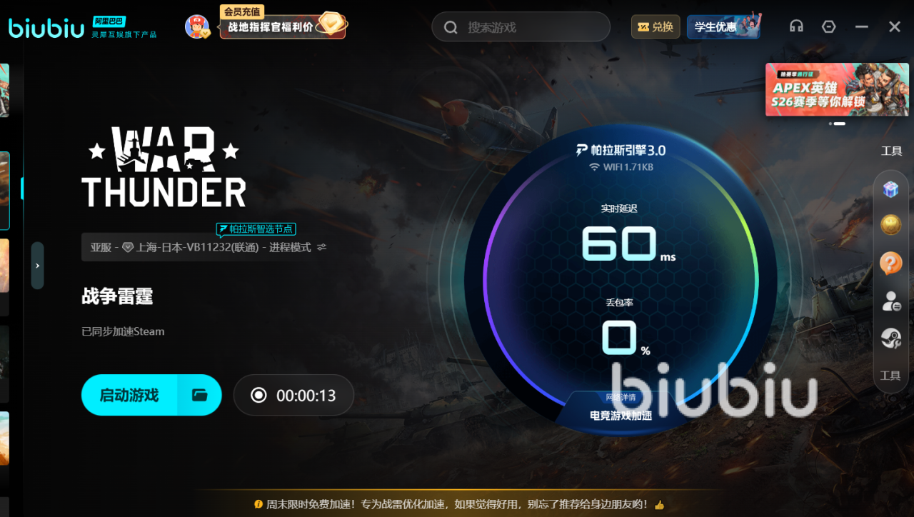 以上就是对战争雷霆进不去应对方法的介绍了,作为一款备受玩家喜爱的军事模拟游戏,如果遇到无法启动的问题,通常可以通过以上方法有效解决大部分情况。尤其是使用biubiu加速器,不仅能优化网络环境,还能享受超值福利,助你畅享游戏的乐趣,希望本文能为你提供实用的帮助。