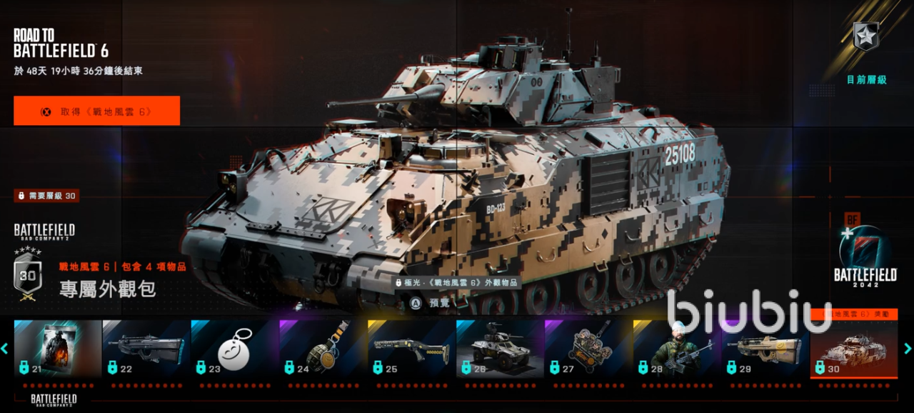 60级奖励:含24件《战地6》预载奖励(角色皮肤“锈蚀突击兵”、武器挂饰“2042徽章”)。