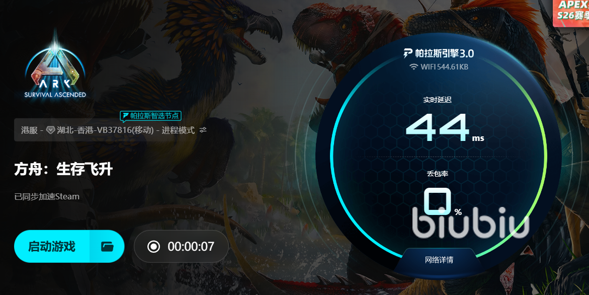 其实飞升黑屏多和数据传输过载有关。仪式过程中,游戏需要同步大量特效数据:光柱的粒子效果、恐龙的攻击动作、传送门的空间扭曲,这些数据堆在一起,很容易让网络传输 “堵车”。尤其国内玩家连接海外服务器时,节点跳转多,一旦某个节点响应慢,就可能触发黑屏。这时候试试biubiu加速器很合适,biubiu在技术上进行了升级,与冠军选手Aixleft合作,并引入了帕拉斯引擎3.0,进一步提升了加速效率和稳定性。这意味着即便在高峰时段或网络波动较大的环境下,也能保证玩家顺利进入游戏,体验流畅的冒险过程。