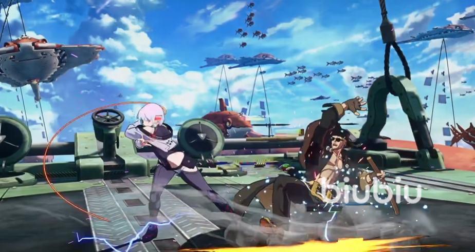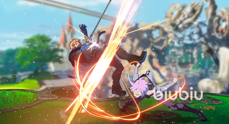 这个角色的战斗风格延续了动画,视觉效果上保留了动画中的紫色系短发以及机械义肢的特征,同时融入赛博画风,比如发光纹路以及粒子特效,走高速双刀流,搭配了罪恶装备本身比较经典的连携技以及ex技系统,走的是近战爆发以及连击的玩法,角色流畅度比较高。