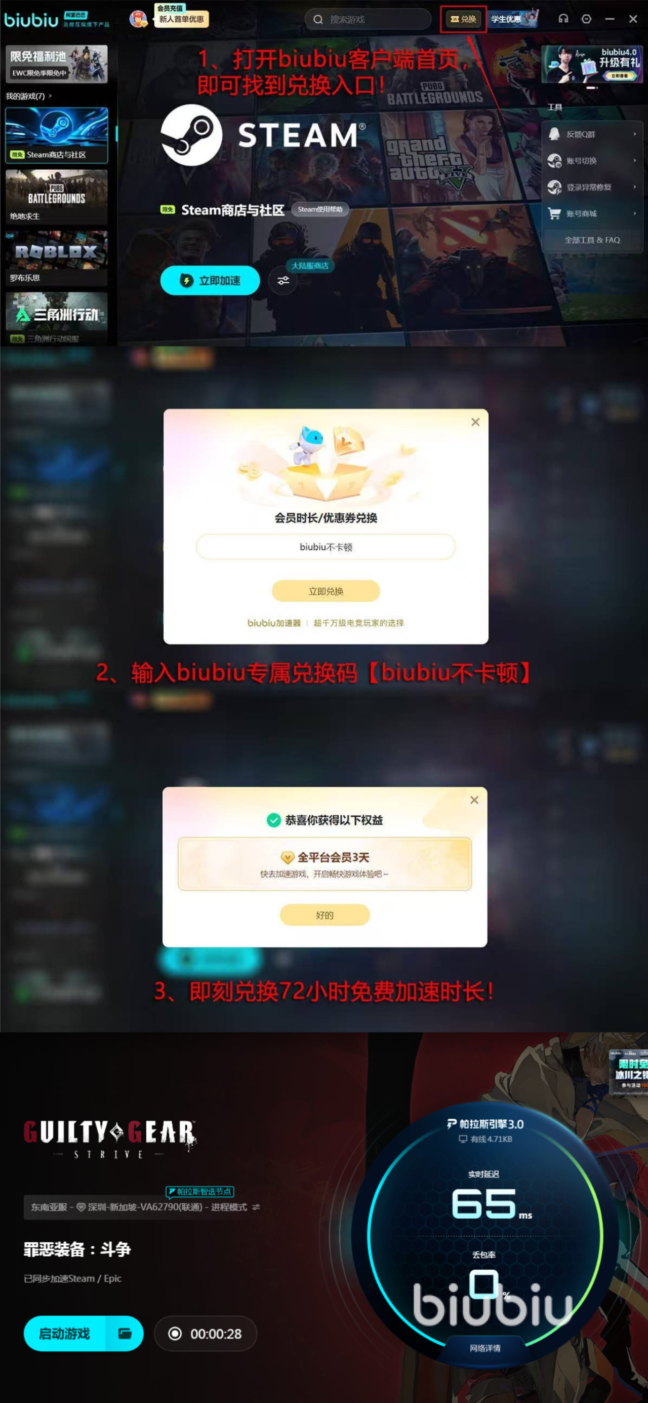 推荐使用biubiu,新人注册立刻就能得到平台赠送的24h提速尝试机会,同时平台每个用户还可以领取三天体验时长,但是需要大家自己在提速页面的左上角输入【biubiu不卡顿】。最近该平台还进行了新的升级,帕拉斯引擎3.0已经出现, 该技术得到了冠军选手Aixleft的认证,质量可以得到保障,小伙伴们可以轻松拥有专业级比赛的体验环境。