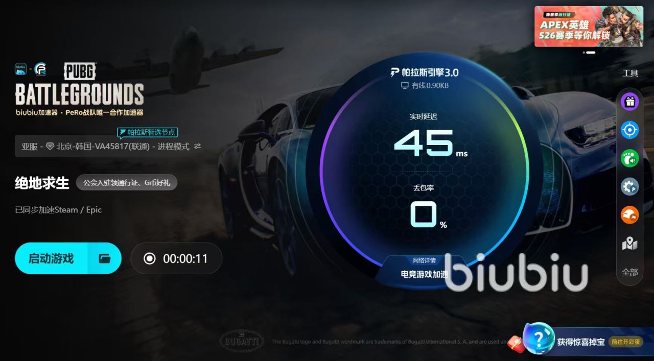 2025年08月25日 14:00 来源:天籁分小火马最近,许多玩家都遇到了绝地求生打开游戏黑屏的问题,有的人点击启动后一直停留在黑屏界面无法进入游戏,有的人能听到声音但画面迟迟不加载,还有人需要多次重启才能成功进入大厅。这种情况不仅耽误时间,还严重影响体验。传统的清理缓存、重装驱动或重启电脑有时并不能彻底解决问题,而网络不稳定往往是关键原因之一。此时,使用biubiu加速器来优化启动阶段的网络连接,往往能有效缓解黑屏卡死现象,让你快速进入战场。