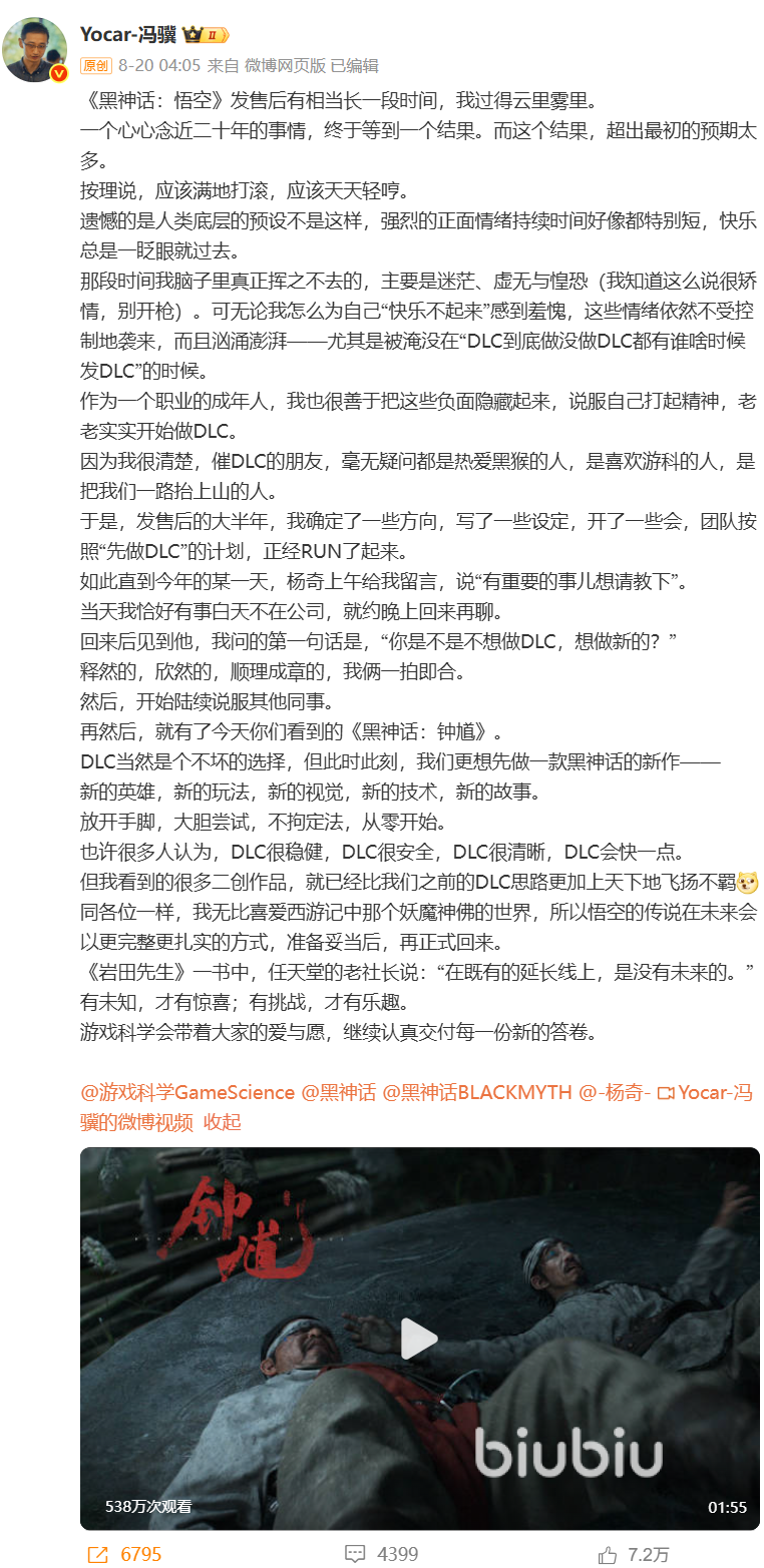 因此DLC并非彻底取消,或后续内容会在 《黑神话:钟馗》之后 “等待合适的时机”再继续开发。未来的“悟空故事”不排除是DLC,也可能是类似《黑神话:悟空2》的独立续作。