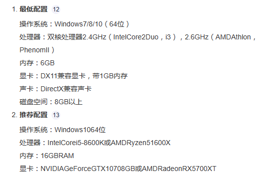 根据官方透露出来的消息,目前想要开到中等画面,起码要满足IntelCorei5-8600K的处理器以及GTX1070-8GB的显卡才能有足够的算力显示出来画面,16GBRAM也是必须的,不然很容易卡顿掉帧,影响大家最终的游戏效果。还好这个算是中配,大部分人都能满足。最低配置虽然要求很低,但那基本只能打开游戏,没有什么画面享受感。各位不要照着这个标准来。