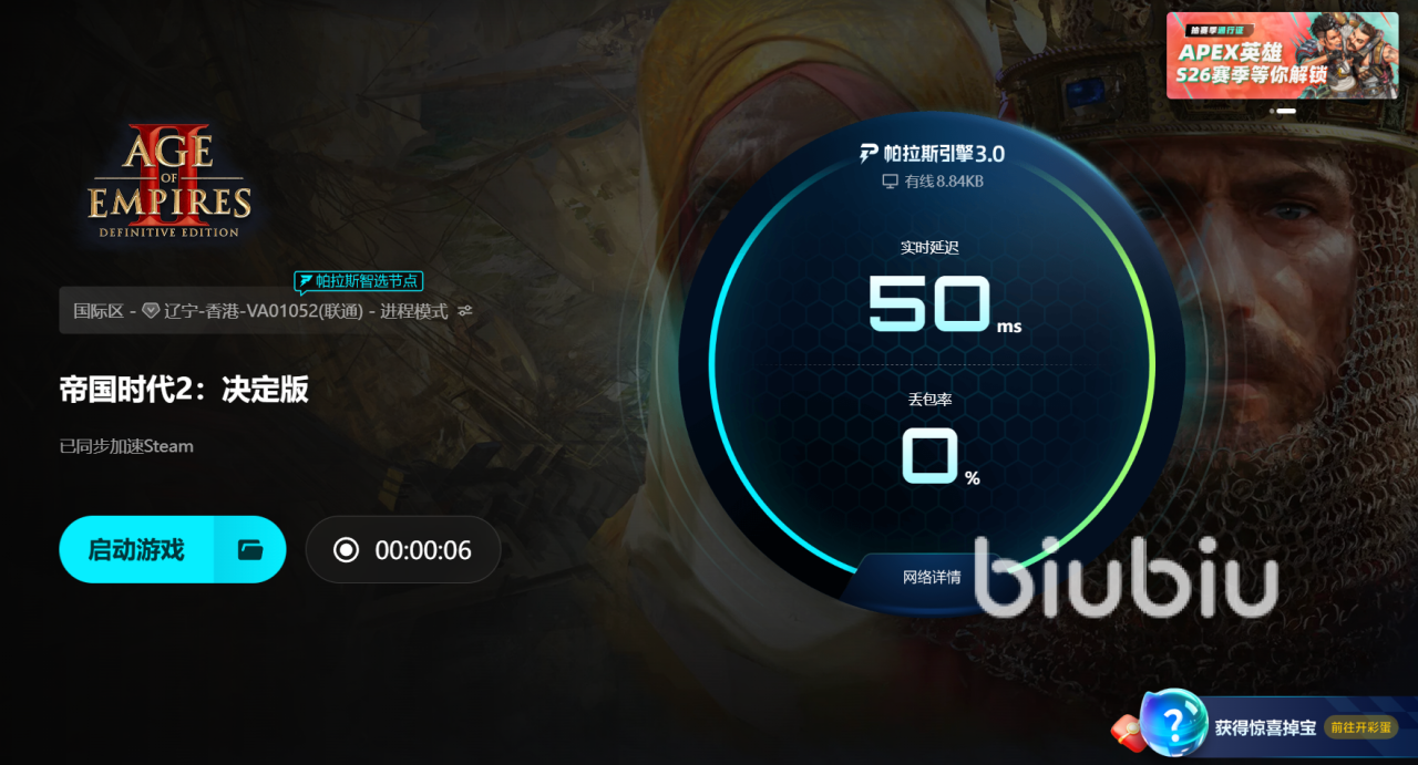 为帮助玩家尽快解决困扰,biubiu加速器提供了福利支持。新注册的用户可以直接领取24小时免费加速时长;同时,所有玩家只需在客户端首页【兑换】页面输入口令【biubiu不卡顿】即可再获得72小时免费加速。这些时长可应用于《帝国时代2》以及其他热门对战类游戏,帮助玩家先体验稳定网络带来的顺畅感。