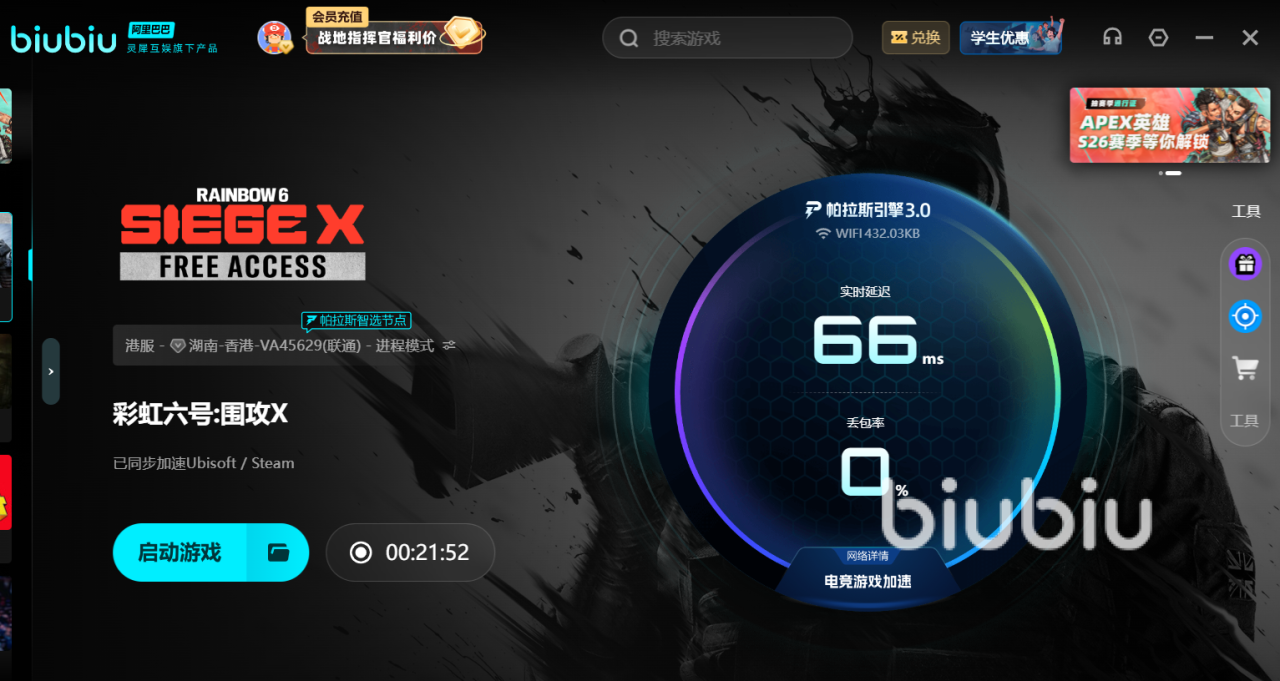 为何biubiu能精准化解闪退,主要是近期联合冠军选手Aixleft完成重磅升级,全新帕拉斯引擎3.0专为彩虹六号围攻等硬核联机游戏深度优化。智能加速平台主动拦截丢包、跳ping等网络顽疾,构建抗干扰能力极强的数据环境,让你的突击突破丝滑流畅不再掉链。